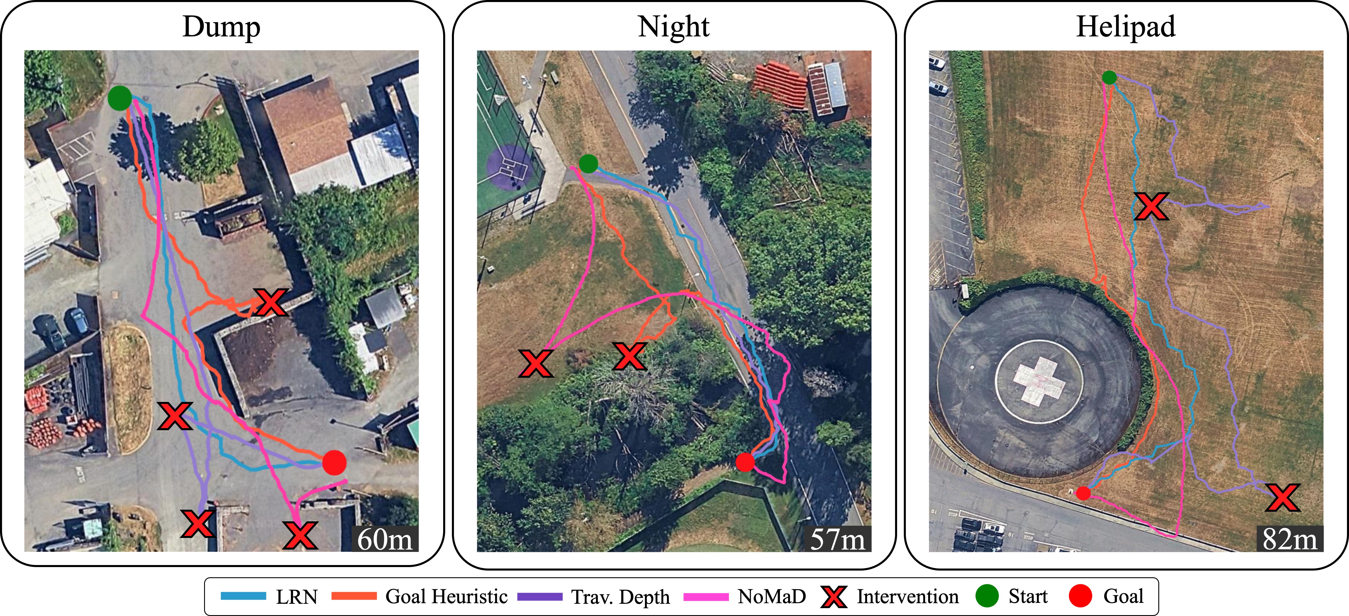A robot navigating an outdoor environment with no prior knowledge of the space must rely on its local sensing to perceive its surroundings and plan. This can come in the form of a local metric map or local policy with some fixed horizon. Beyond that, there is a fog of unknown space marked with some fixed cost.